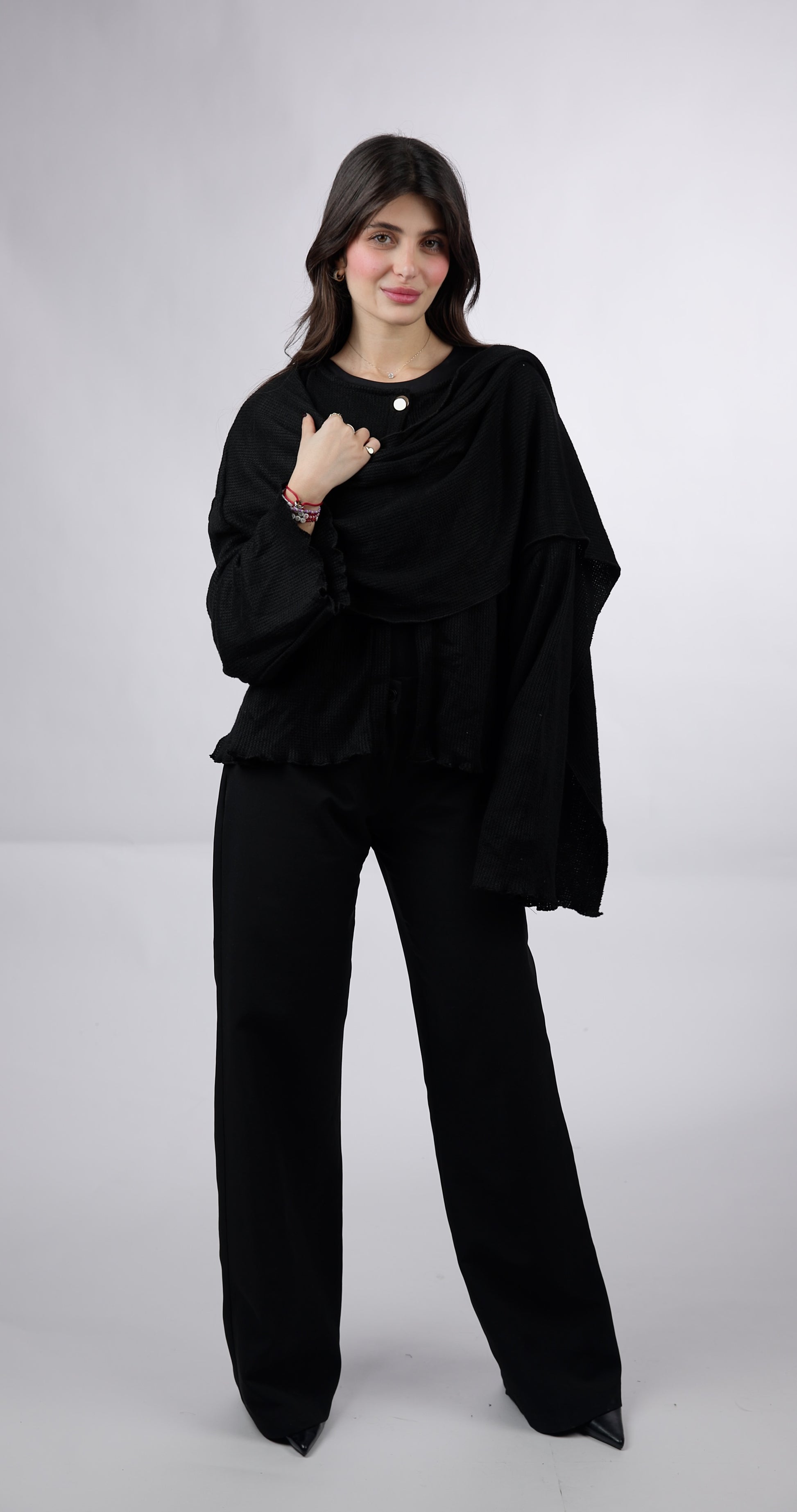 Knit cardigan with a draped shawl over one shoulder, finished with a single-button closure. Light, airy, and effortlessly elegant.