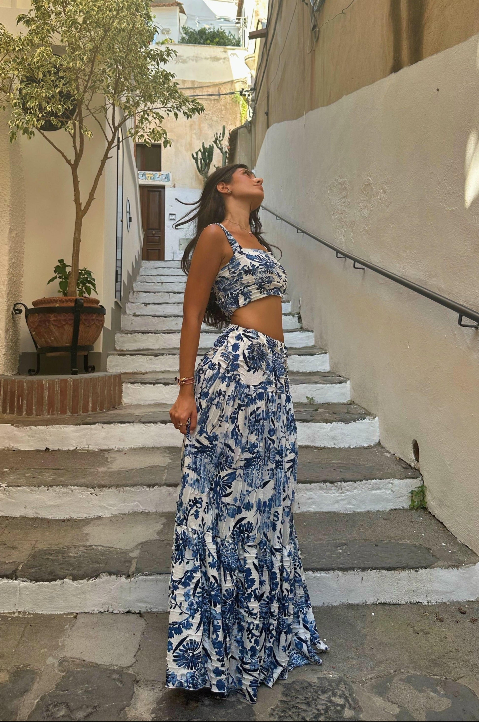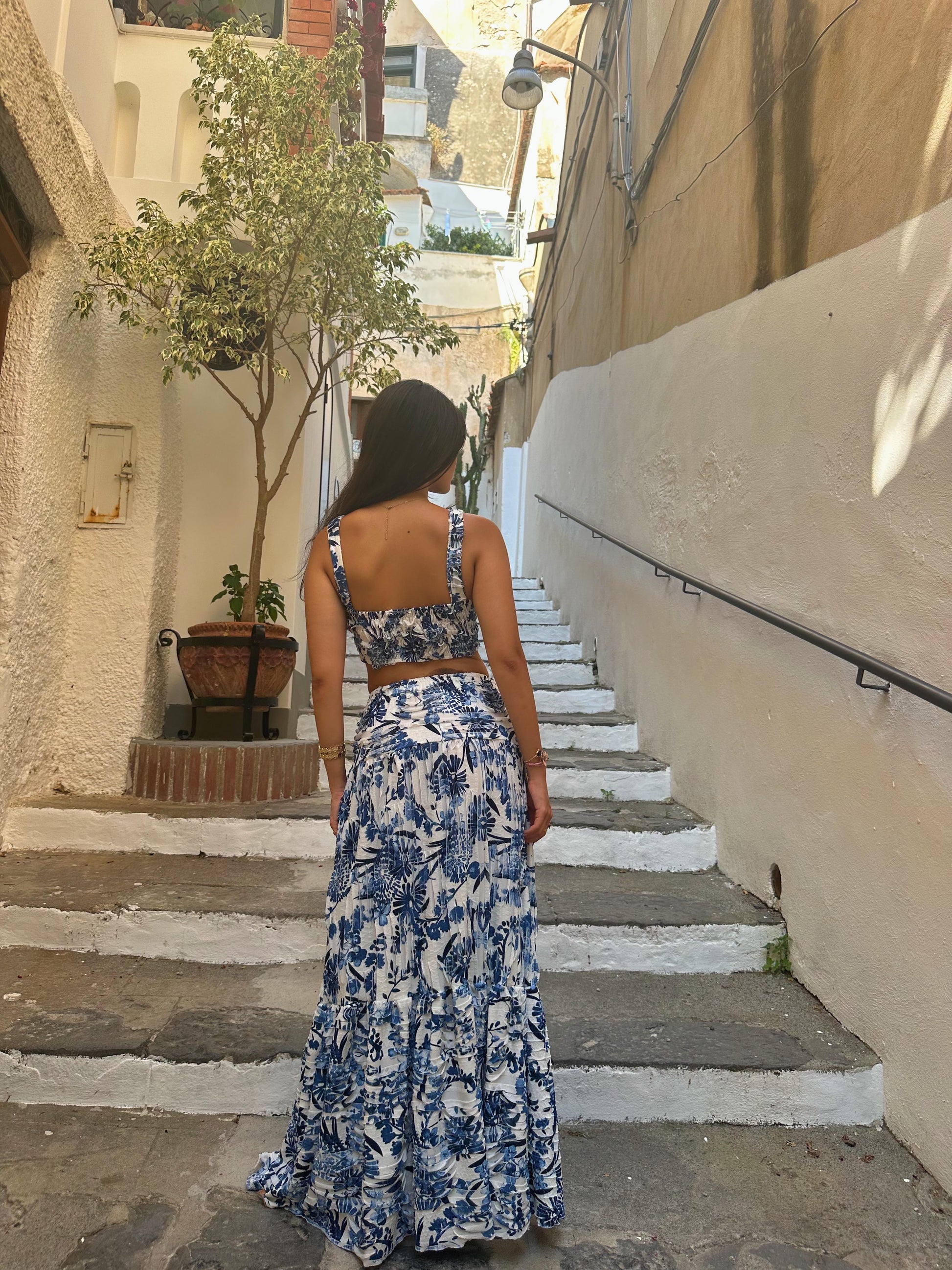 A ruched crop top paired with a flowing tiered maxi skirt, crafted in soft, breathable fabric with a bold blue floral print and an ultra-stretchy fit that moves with you.