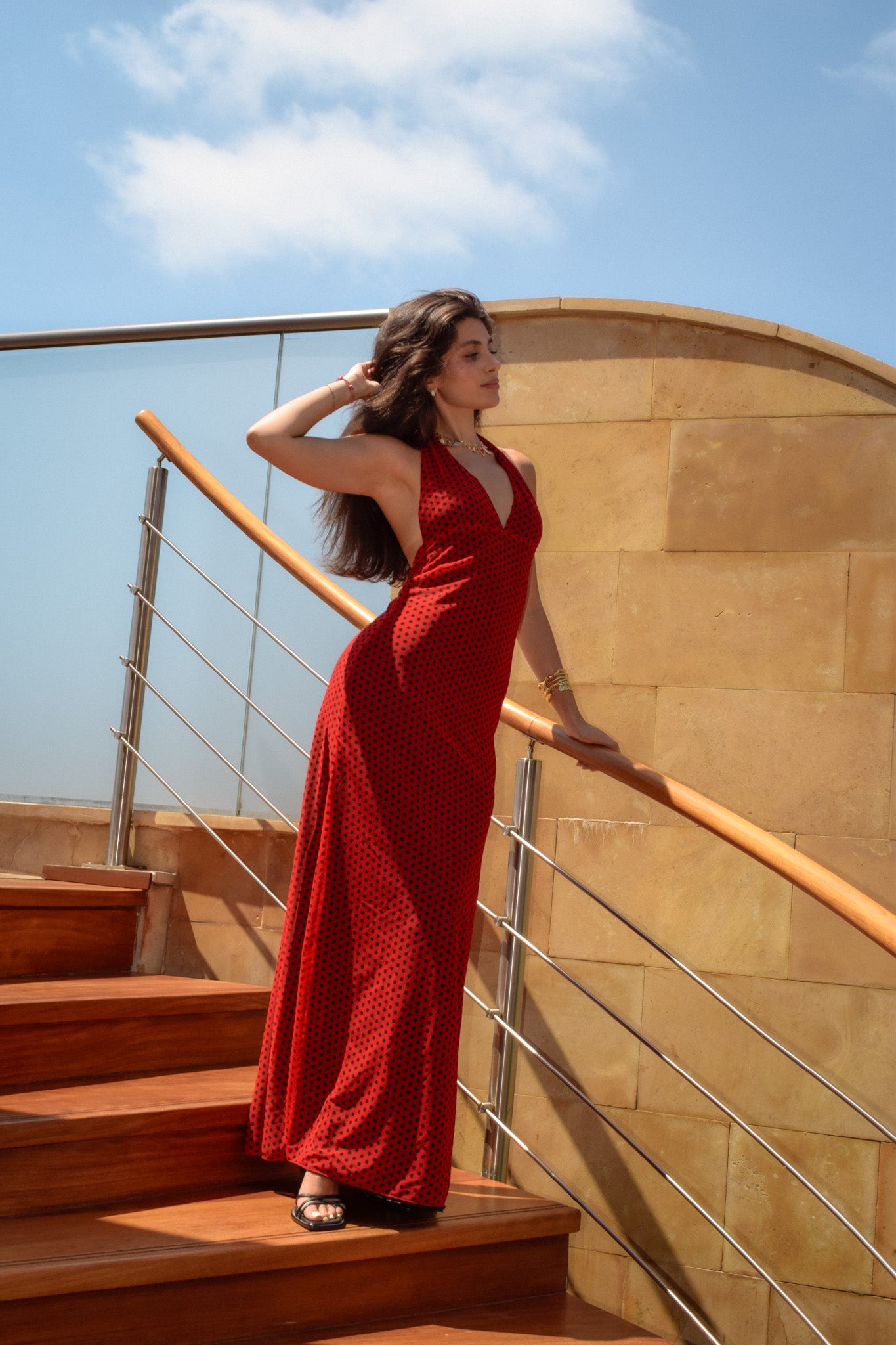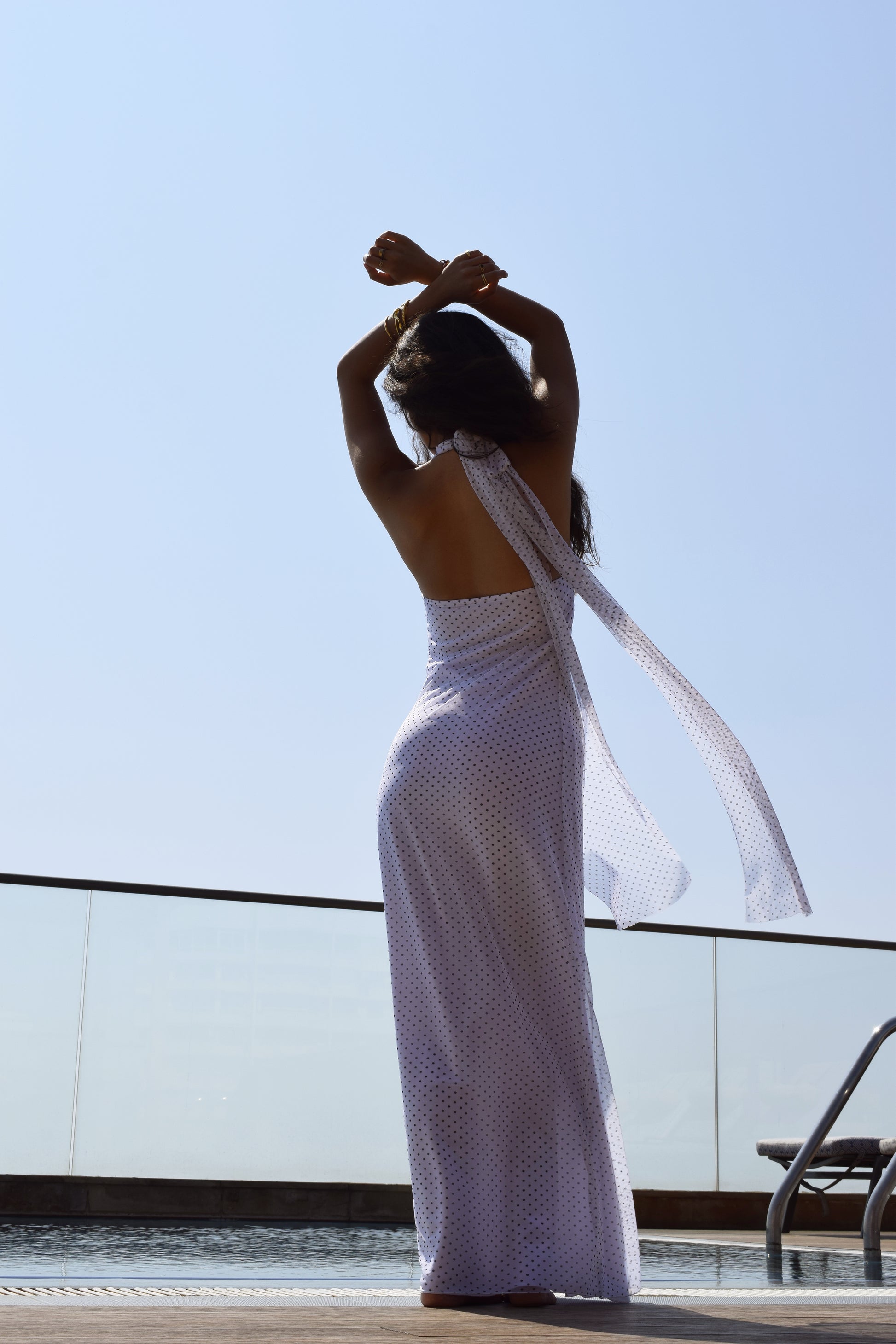 A timeless silhouette with a playful twist. This halter-neck maxi features this summer’s must-have print — polka dots — and is fully lined with dress fabric for a smooth, no-show finish. It drapes beautifully over the body and moves effortlessly with you. Perfect for summer nights and special plans.