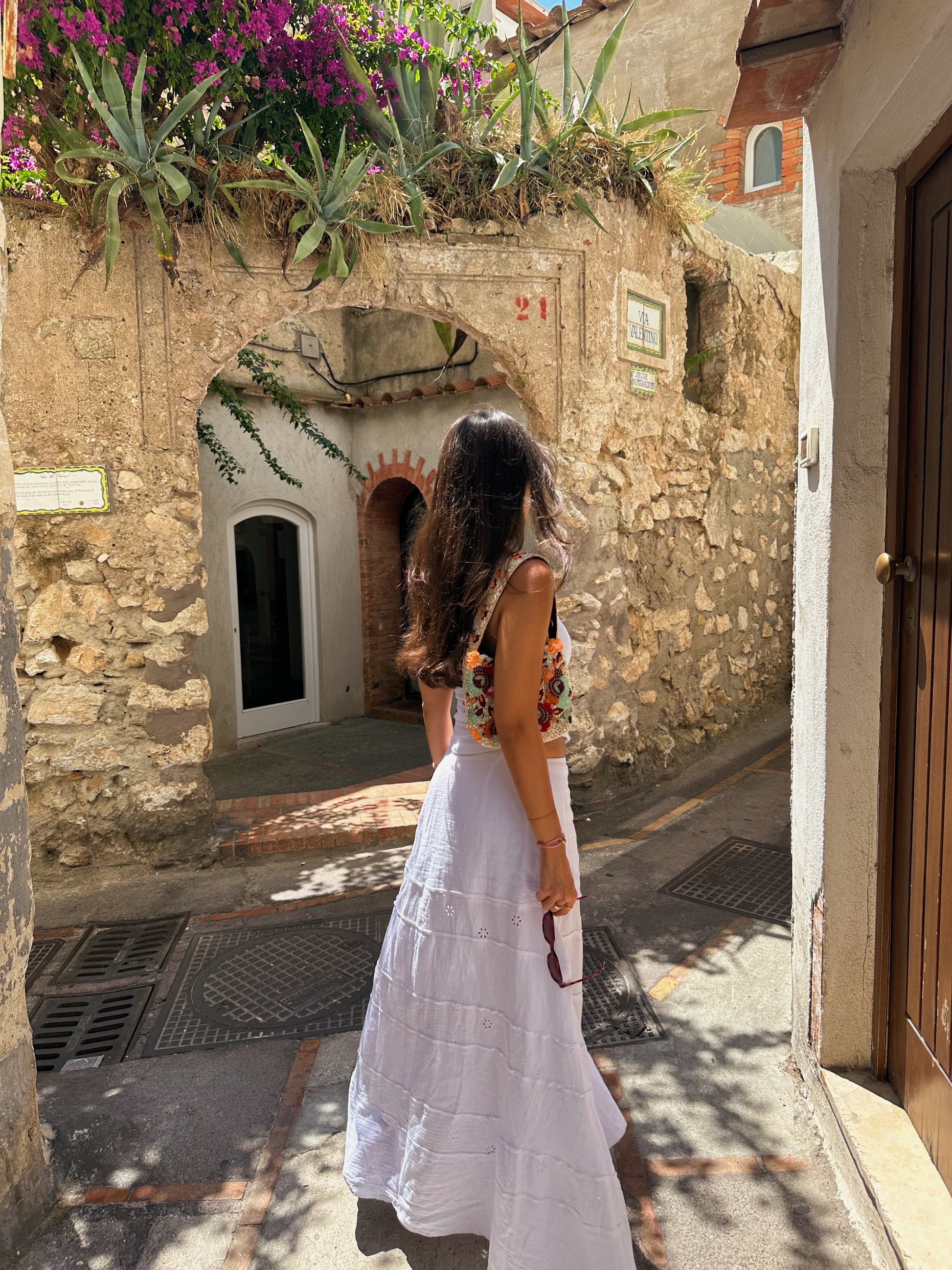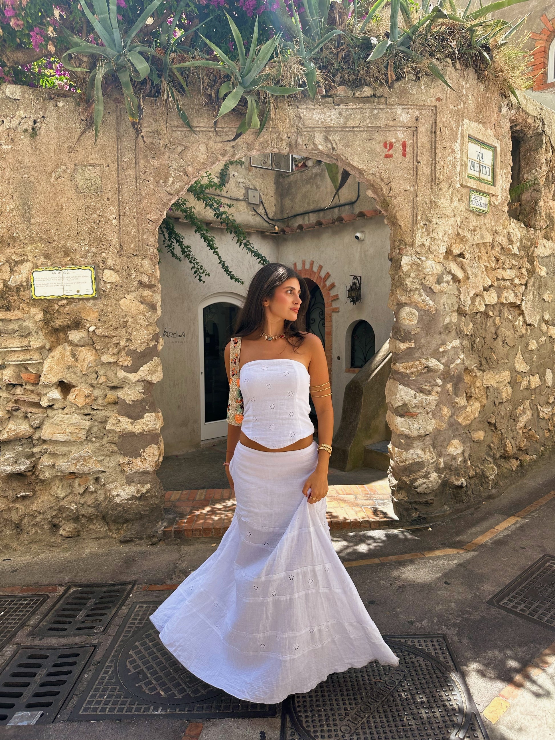 Crafted from a breathable linen-cotton blend, this set features a fully lined, structured strapless corset with floral embroidery that continues into a matching full-length skirt. The skirt is half-lined with the same fabric, offering subtle leg exposure through the embroidered cut-outs — striking a balance between sultry and sophisticated.