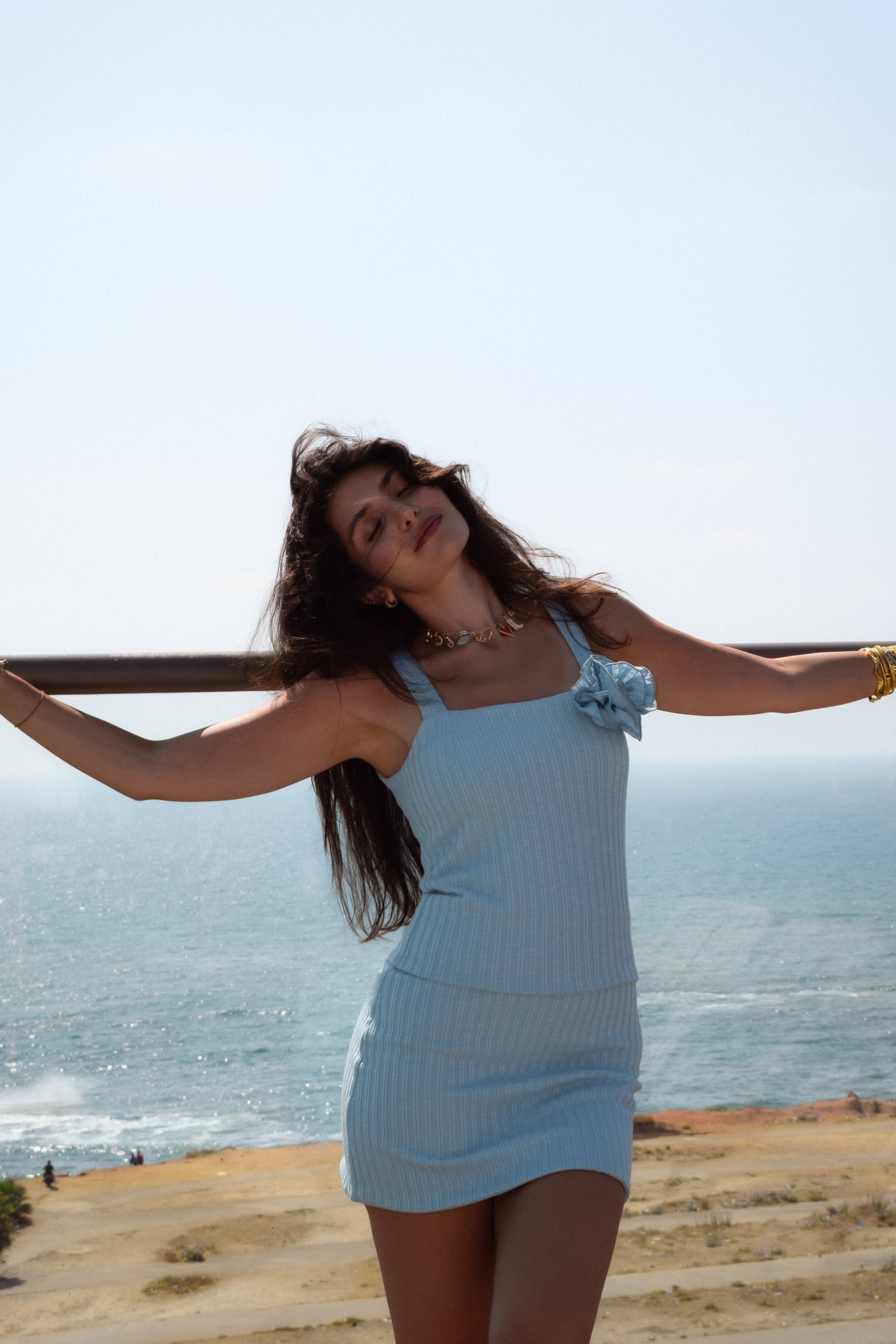 Soft, sunny, and endlessly wearable — this double-layered ribbed set features a square-neck top with a handmade flower and a matching skirt that can be worn high for a clean, dress-like look or folded low for a more casual, shorter silhouette. Goes with kitten heels, slides, and everything in between.